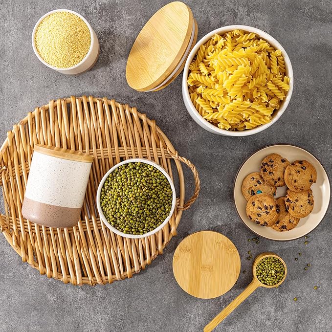 Yangbaga Canister Sets for Kitchen Counter, 20 OZ Large Ceramic Food Storage Jars with Airtight Wood Lids, Large Kitchen Canisters for Coffee, Sugar, Tea, Flour, Spice