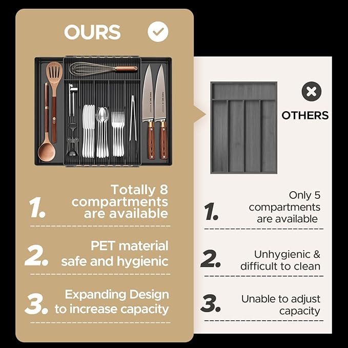 - Large Capacity: Comes with 6 compartments and two expandable panels on the left and right, this silverware drawer organizer accommodates a wide range of silverware, cutlery, and kitchen utensils