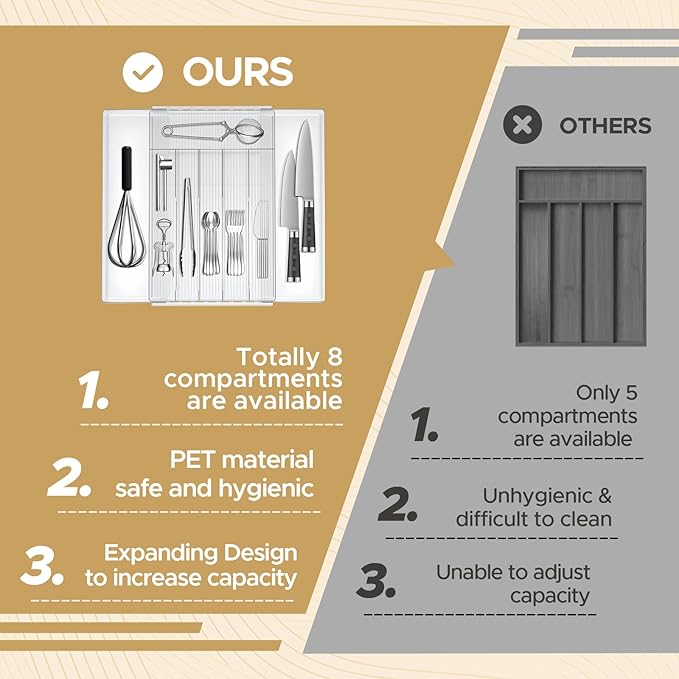 - Large Capacity: Comes with 6 compartments and two expandable panels on the left and right, this silverware drawer organizer accommodates a wide range of silverware, cutlery, and kitchen utensils