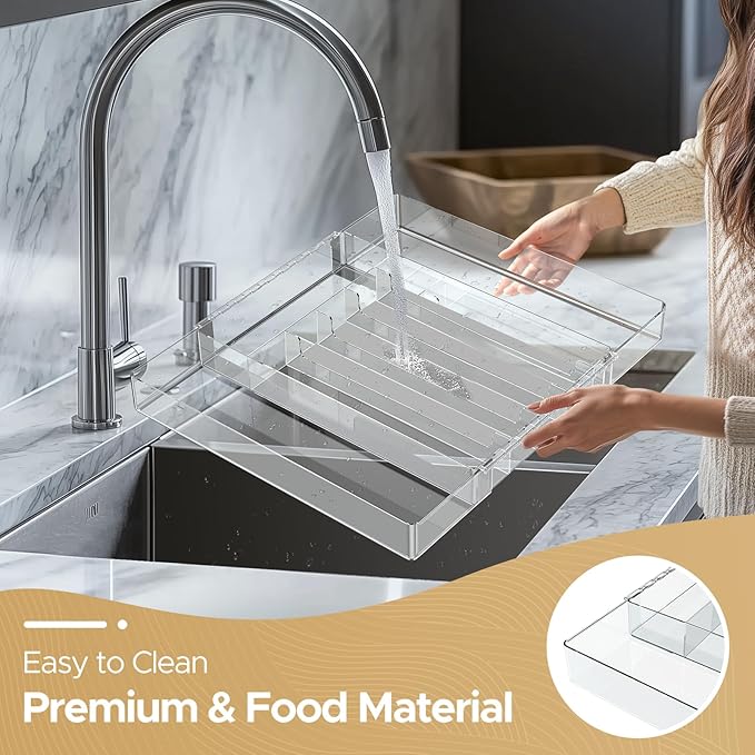 - Easy to Use: Our cutlery drawer organizer is designed for drawer storage space, keep the drawer organized. It easy to clean with water or wipe dry with a cloth (not dishwasher safe)