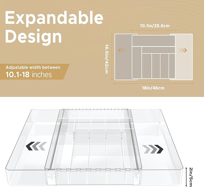 - Adjustable Fit: When fully expanded, the kitchen utensil organizer dimensions are 18 x 16.5 x 2 inches and when fully folded, it reduces to 10.1 x 16.5 x 2 inches. This utensil drawer organizer is designed to be adjustable, accommodating various drawer sizes and shapes