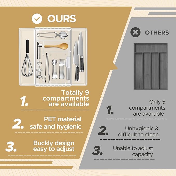 - Large Capacity: Comes with 6 compartments and two expandable panels on the left and right, this silverware drawer organizer accommodates a wide range of silverware, cutlery, and kitchen utensils