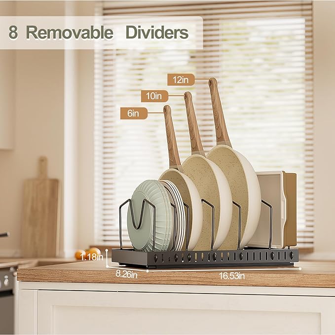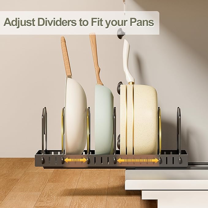 - [ VERSATILE AND ADJUSTABLE DIVIDERS ] With 8 adjustable dividers per set, 2 sets total, this cabinet organizer isn't just for pots and pans. lt can accommodate everything from 6-12 inch lids and pans to cutting boards, baking sheets, and more. And when you remove the dividers, it transforms into a slide-out cabinet organizer. Ideal for small kitchens and apartments, it’s a must-have for anyone looking for adaptable storage solutions