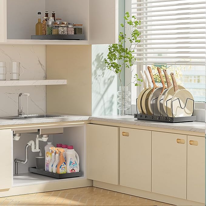 - [ EASY SLIDE-OUT DESIGN ] No more crawling or playing detective in your deep cabinets. Our pull out pot and pan organizer makes it a breeze to find and store your pots and pans. Just slide the tray out to easily access everything, saving you time and hassle in the kitchen, eliminating the frustration of digging through cluttered cabinets