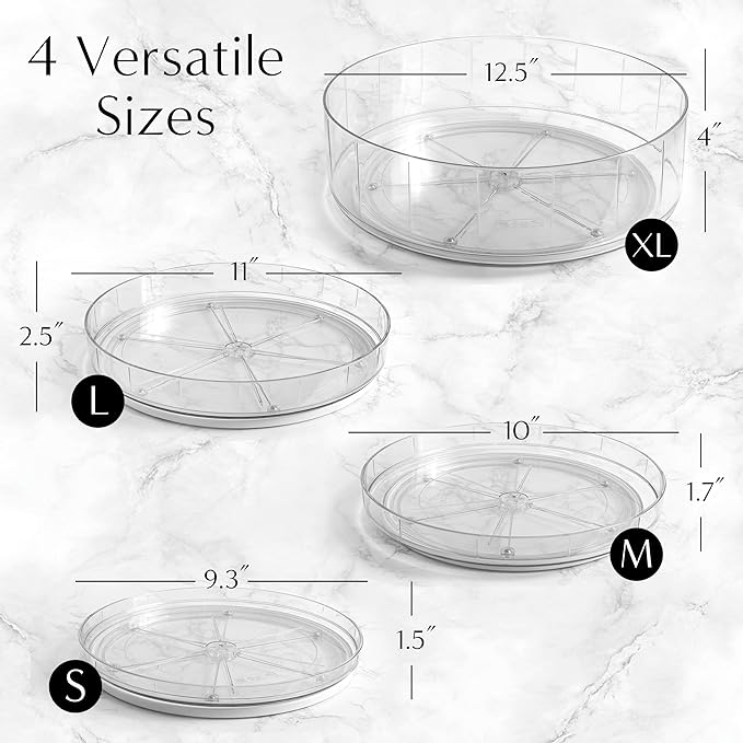 - Versatile Multi-Size Set of 4: Includes 9.3", 10", and 11", 12.5" Lazy Susan turntables. Choose the ideal size for your fridge organizer, cabinet organizer, pantry organizer, or bathroom countertop organizer