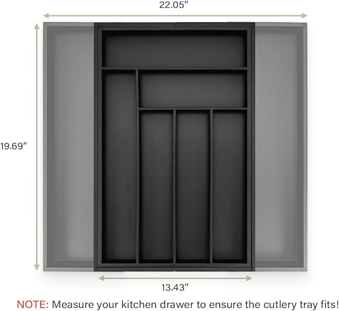 - EXPANDABLE: This cutlery tray fits into any drawer. When collapsed, the utensil drawer organizer measures 12.05 x 18.5 x 1.97 inches, and when extended, it measures 19.69 x 18.5 x 1.97 inches.