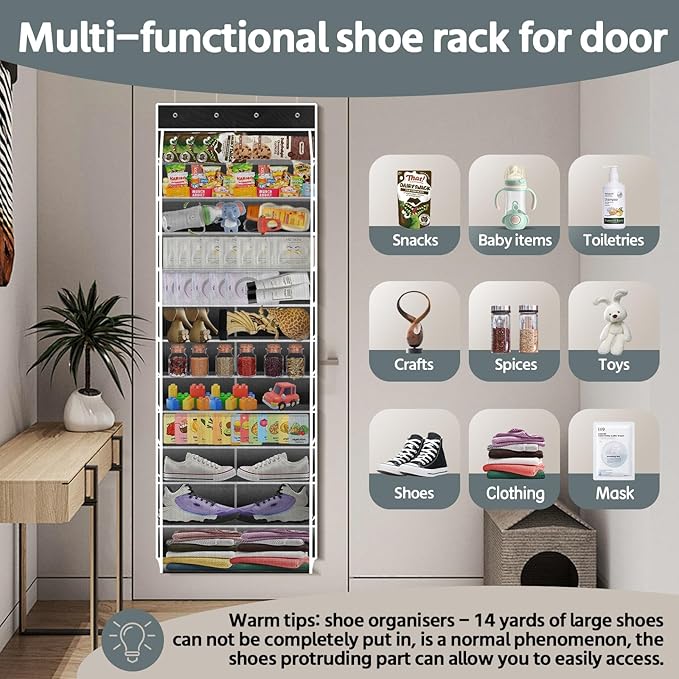 - 🥾👒👘【MULTIFUNCTIONAL HANGING STORAGE POCKET 】:This over-the-door shoe organizer can not only be used to store shoes, but can also be hung on your bathroom door to store beauty products, toiletries and household cleaning supplies, or mounted on the back of your pantry closet door to store socks, scarves, undergarments, baby clothes and more. You can even store toys, snacks, and kitchen supplies. Such a practical door shoe rack can not only help you save space, but also keep your home clean and tidy, say goodbye to clutter, simply a good helper for home storage.