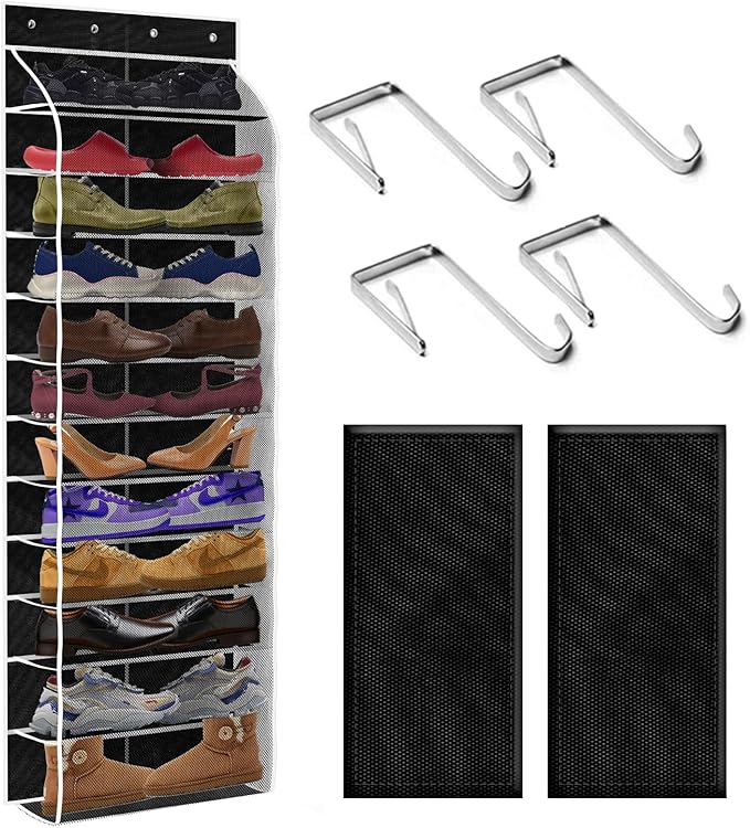 12 Pocket Over the Door Shoe Organizer,Reusable Breathable Large Mesh Bag Men's & Women's Sneaker Organizer,Shoe Organizer for Kids,Hanging Shoe Storage Hanging Bag (Black)