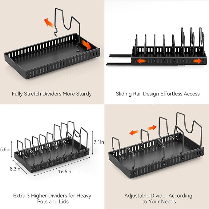 - Special Feature : Sliding Out Design, Rust resistant pan organizer, Adjustable Dividers, Detachable pot organizer