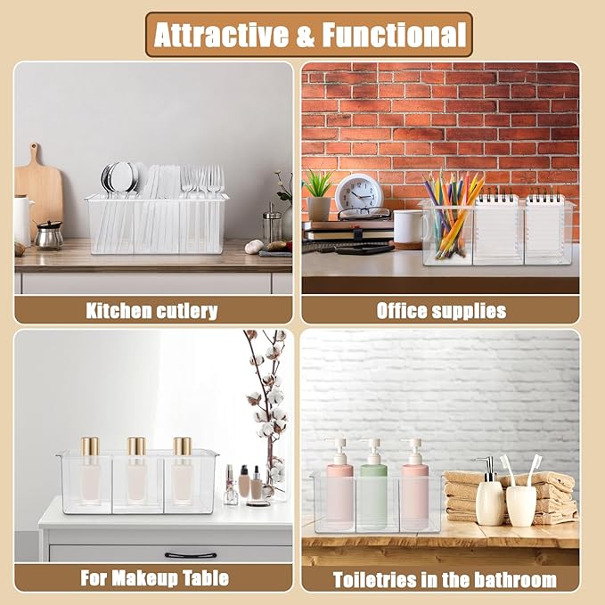 - Clear Silverware Holder: This silverware caddy features a beautiful, classic design that with 3 separate compartments which is perfect for knives, forks, and spoons, and will help you keep your cutlery or other kitchen essentials separated and organized.