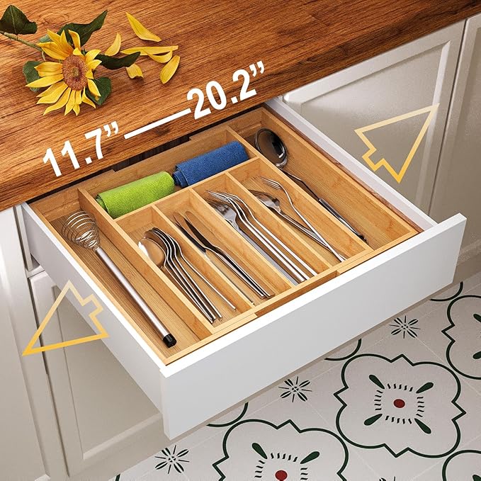 Expandable Kitchen Drawer Organizer,Bamboo Silverware Organizer for Utensils,Adjustable Flatware Tray(14.96 * 11.69~19.68 * 1.96)