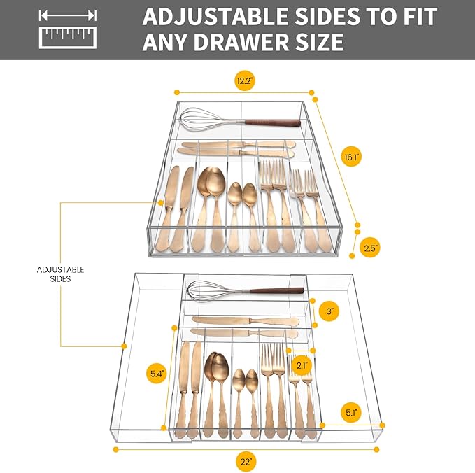 - 【EXPANDABLE AND ADJUSTABLE】: Designed with 7 flatware compartments and two expandable sides, this utensil organizer offers additional storage space for your cutlery. It expands from 12” to 23” wide, easily fitting into most kitchen drawers, and can be adjusted to your drawer’s width for a customized and smooth experience.