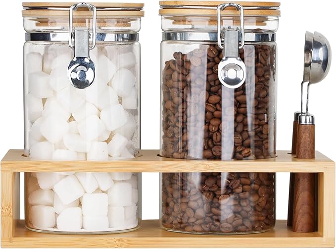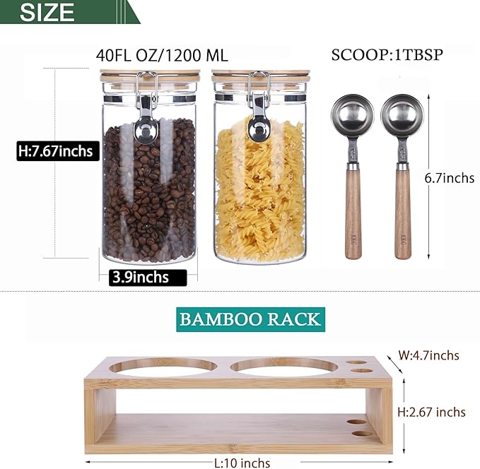 - Complete Set Includes:2 glass sealed jars (Height 7.67'' x Diameter 3.9'',Capacity:40fl oz/1200ml),2 wooden handle coffee scoops(1 TBSP, L:6.7'') and 1 bamboo rack(10'' x 4.7'' x 2.67'' ,L x W x H).