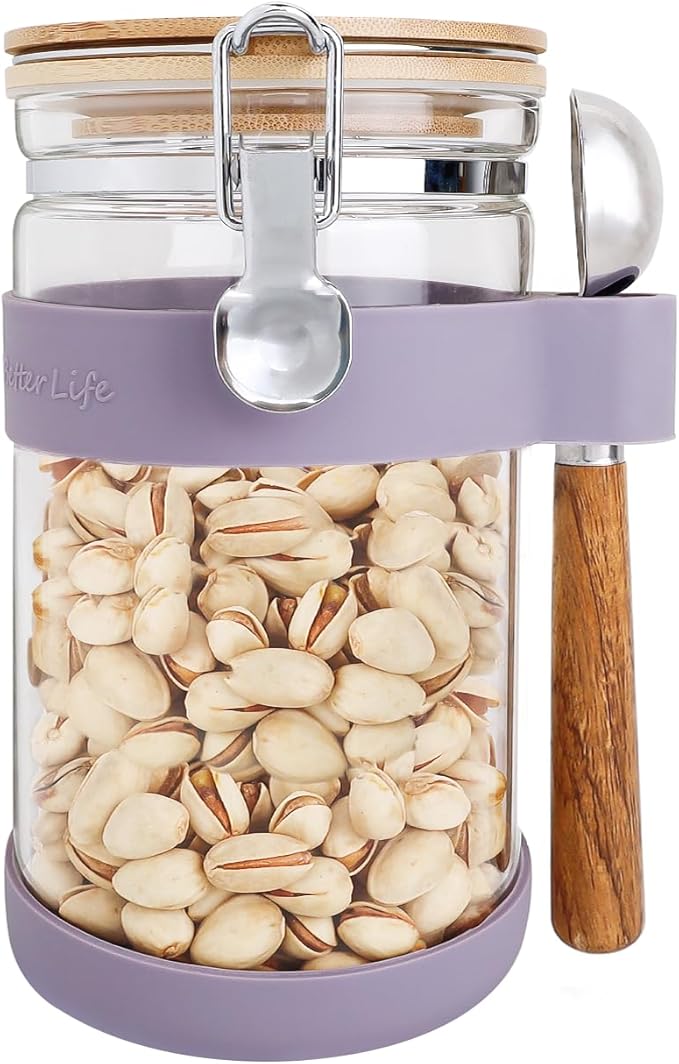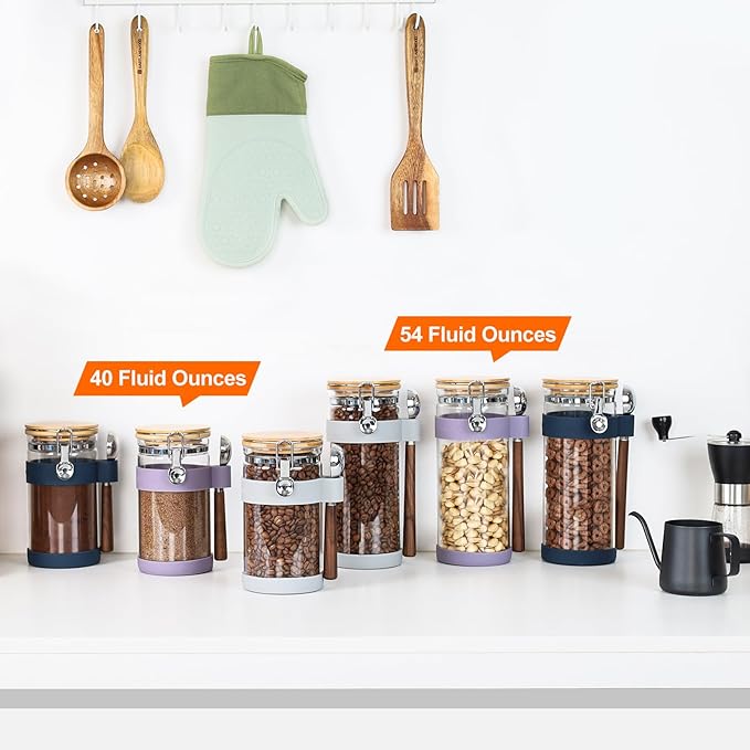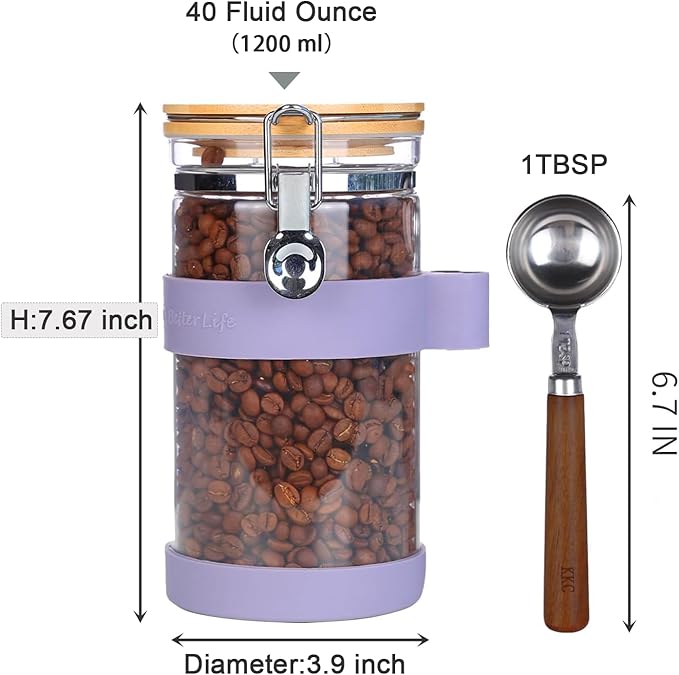 - Glass canister with scoop:Includs glass sealed canister (Height 7.67'' x Diameter 3.9'',Capacity:40oz/1200ml),1 coffee scoop(1 TBSP, L:6.7'') and purple silicone case(scoop holder and bottom anti slip cover).