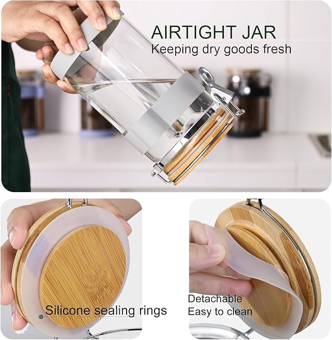 - Glass storage jar with airtight locking clamp lid: equipped with locking clamp and silicone sealing ring to achieve airtight sealing and keep the dry goods inside fresh. The lid is firmly secured to the jar and maintains the quality of your stored items over time. The lid opens effortlessly—simply release the clamp to access your items with ease.