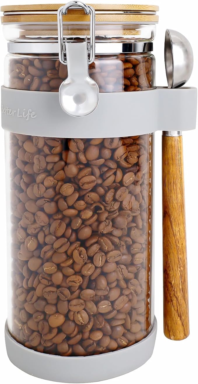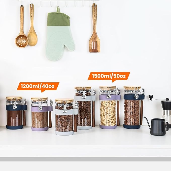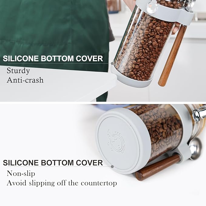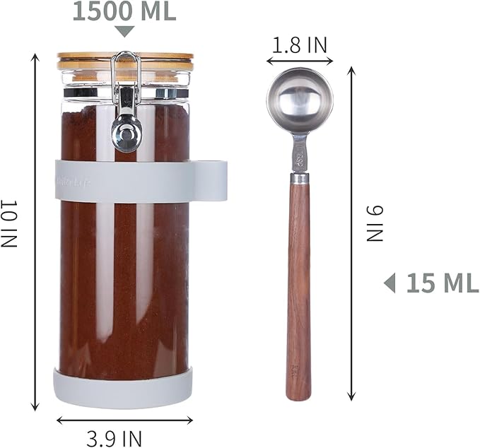 - Complete Set Includes:1 glass sealed canister (Height 10'' x Diameter 3.9'',Capacity:50fl oz/1500ml),1 long handle coffee scoop(1 TBSP, L:9'') and grey silicone case(scoop holder and bottom anti slip cover).