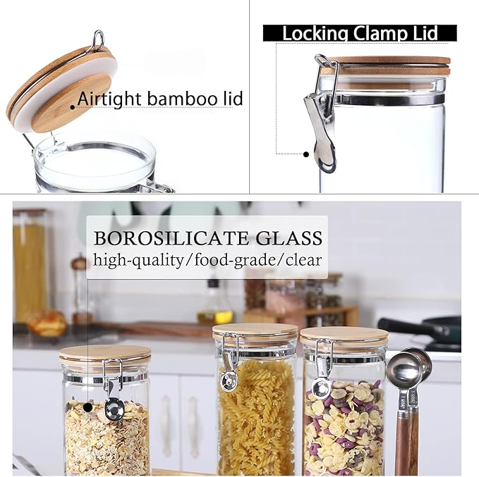 - Airtight Glass Storage Jar with Locking Clamp Lid: Equipped with locking clamp and silicone sealing ring to achieve airtight sealing and keep the dry goods inside fresh. The lid is firmly secured to the jar and maintains the quality of your stored items over time. The lid opens effortlessly—simply release the clamp to access your items with ease.