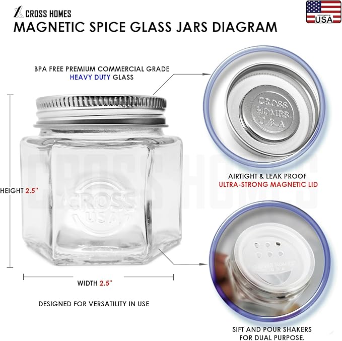 • HIGH STRENGTH MAGNETS WITH STYLISH HEXAGON JARS SAVING YOUR VALUABLE KITCHEN SPACE: Our spice jars include an ultra-strong neodymium magnet securely enclosed under each lid. This ensures a strong stick to any metal surface, including the swinging fridge door, side of the refrigerator, backsplash magnetic spice jar metal board and more. The high strength also makes our jars the perfect storage solution for mobile homes, RVs and boats. PERFECT SPACE SAVER SPICE CONTAINER SET!