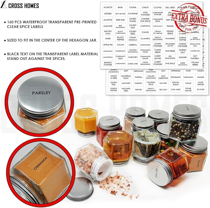 • COMPLETE MAGNETIC SPICE RACK SET OF 15 LARGE HEXAGON GLASS SPICE JARS FOR CREATE A DIY HANGING SPICE RACK ON YOUR OWN FRIDGE, REFRIGERATOR, CABINET AND WALL MOUNT: 15 Complete Sets including 15 pcs Clear Hexagon Glass Jars with Airtight & Leak Proof Magnetic Lids + 15 pcs Shakers + 160 pcs Transparent Pre-printed Spice Labels included.