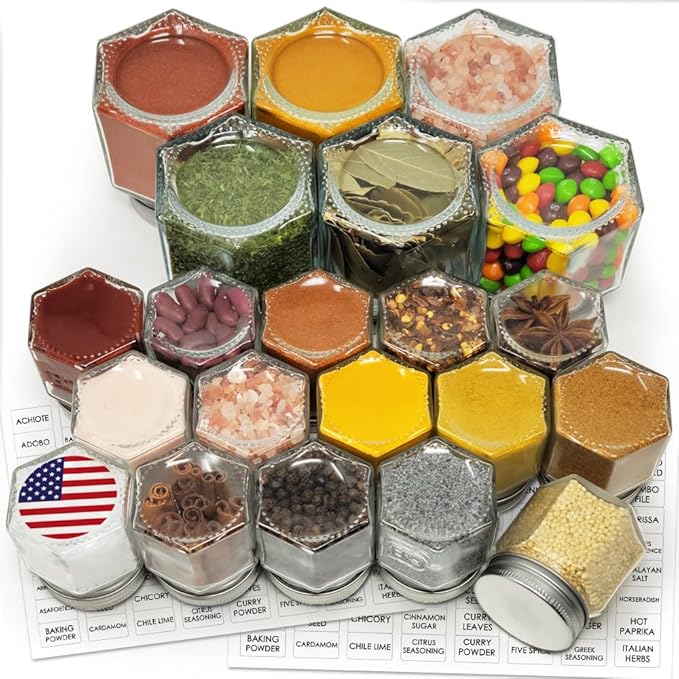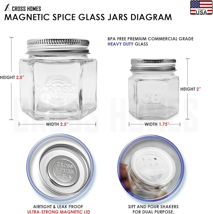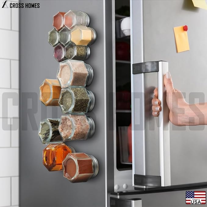 - HIGH STRENGTH MAGNETS WITH STYLISH HEXAGON JARS SAVING YOUR VALUABLE KITCHEN SPACE: Our spice jars include an ultra-strong neodymium magnet securely enclosed under each lid. This ensures a strong stick to any metal surface, including the swinging fridge door, side of the refrigerator, backsplash magnetic spice jar metal board and more. The high strength also makes our jars the perfect storage solution for mobile homes, RVs and boats. PERFECT SPACE SAVER SPICE CONTAINER SET!