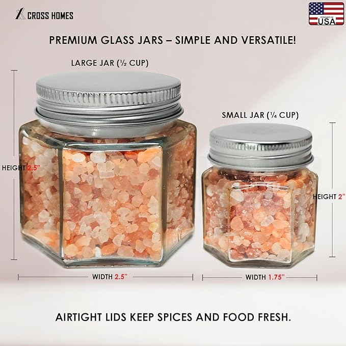 - PREMIUM COMMERCIAL GRADE HEAVY DUTY HEXAGON GLASS JAR WITH AIRTIGHT SCREW LIDS DESIGN: Our unique glass jar design makes for a beautiful look in your kitchen while also saving space vs. a round or square design jars. Small jars are 2” tall x 1.75” wide and hold a shy 1/4 cup volume, Large 4 oz jars measure 2.5” tall x 2.5” wide and hold a heaping 1/2 cup volume. Our airtight screw lid is designed for preventing any pop off, loose lids issue. Our lids always stay on securely.