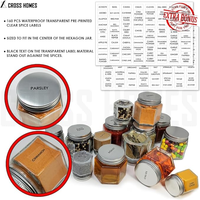 - ALL ACCESSORY INCLUDED IN ONE BOX: SIFT AND POUR SHAKERS for dual purpose. Pouring out granulated spices and herbs on one side and sprinkling powdered spices on the other. You can season your dishes without getting your hand dirty. WASHABLE WATERPROOF TRANSPARENT PRE-PRINTED SPICE LABELS can be placed on lids or glass bottoms. This is the only spice holder set you'll ever need. *SPICES ARE NOT INCLUDED*