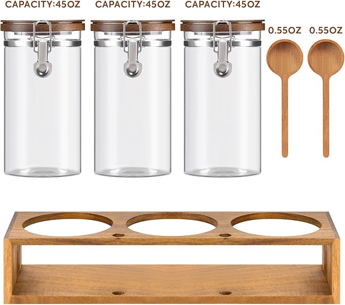 - COFFEE BAR ORGANIZER:There is a wood spoon for food scooping. After you use the spoon. And you can put it directly on the wood holder without messing up the tabletop.You can also DIY the shelf, hanging on the wall, table corners, etc., used to store pet food.The lid, spoon and stand are the same color which could be a great decor.