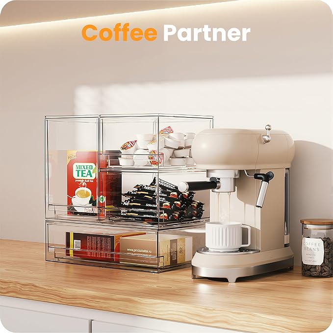 - 【Grab & Go with Ease】— These drawers feature a built-in handle, making it easy to access your items, even in tight spaces.In kitchen cabinets, use these organizer bins to organize sauces, snacks, spices, coffee, honey, cookies, and candies.Under the sink, they are perfect for storing sponges, brushes, trash bags.In the refrigerator, use them for cheese slices, eggs, jam, and fruit. These clear storage bins help keep your kitchen neat.