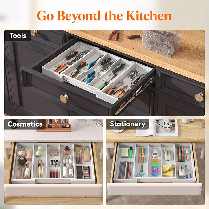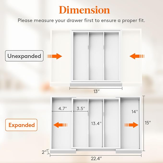 - Perfect Organizer: This 2-inch high silverware drawer organizer features 3 large compartments (13.4" x 3.5"/ 34 x 8.9 cm) and 2 expandable slots (14" x 4.7"/ 35.6 x 11.9 cm ), providing ample space for utensils like knives, spoons, tongs, etc.