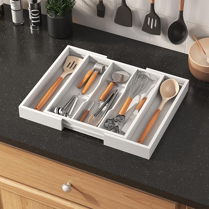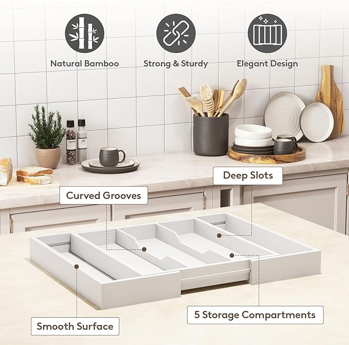 Lifewit Utensil Organizer for Kitchen Drawer, Expandable Cooking Utensil Tray, Bamboo Cutlery Silverware Flatware Holder, Adjustable Spatula Tools and Gadgets Storage Divider, Large, White
