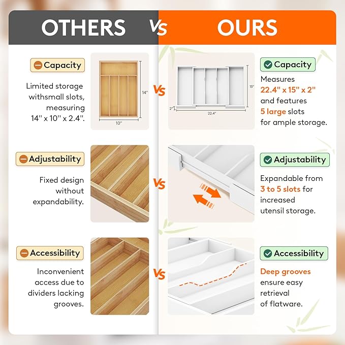 - Humanized Design: Groove design for easy cutlery retrieval, eliminating messy drawers; also easy to clean, just a gentle wipe makes it look like new