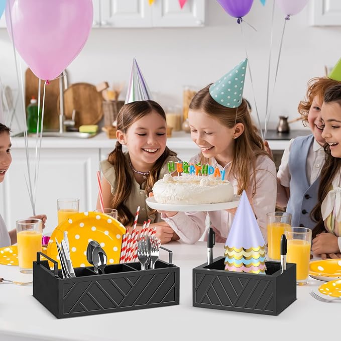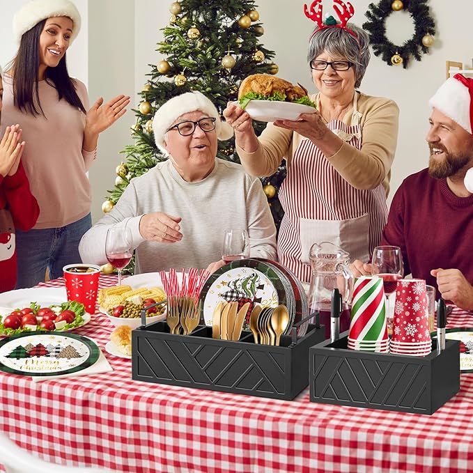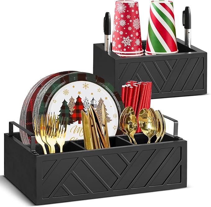 - 【CONVENIENT SILVERWARE CADDY HOLDER FOR WIDE APPLICATION】Our wood paper plate holders with handle is easy to carry anywhere and is ideal for picnics, barbecues, camping, parties, buffets, BBQ, RVs and other outdoors scenarios. This farmhouse utensil holder for party will brighten their eyes when your friends and family pick up their plates from the wooden paper plate caddy organizer. With attached makers you can also DIY your names and patterns on the cups to make your cups unique.
