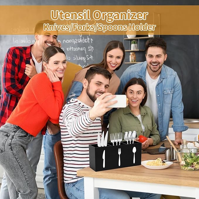 Plastic Utensil Holder, Knife Fork and Spoon Holder Silverware Caddy, Acrylic Kitchen Cutlery Storage Box, Flatware Organizer for Countertop, Indoor Outdoor Party Tableware Holder (Black)