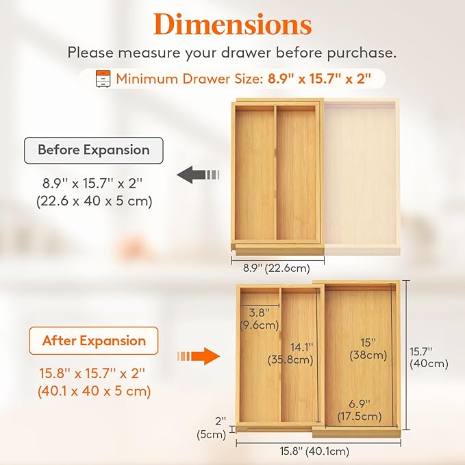 - Expandable Design: This utensil drawer organizer can expand from two compartments to three and measures 15.8 x 15.7 x 2 inches after expansion, providing extra storage space. With an adjustable width range of 8.9-15.8 inches it ensures a perfect fit for most drawers