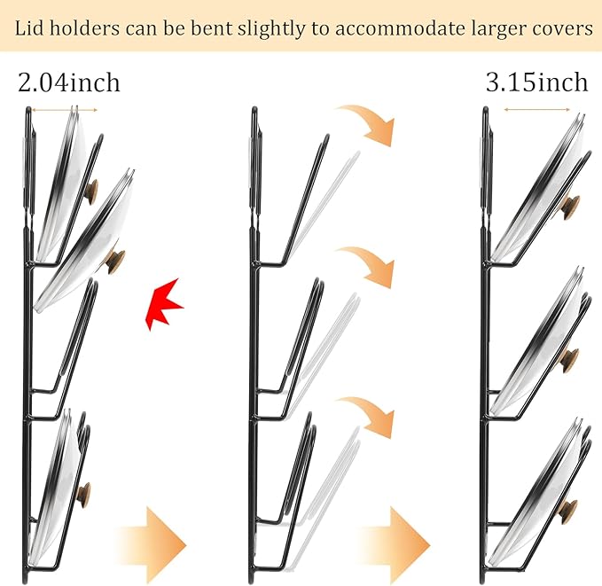 - Maximize Your Space:Our 2-pack pot and pan organizers with 6 tiers can hold all of your lids. Tip: The lid rack can be bent slightly to allow it to accommodate larger lids, but please DON'T excessively bend the lid rack with excessive force or the lid holder may protrude too much and the may not close.