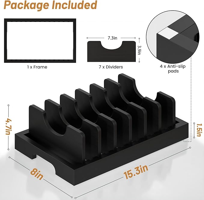 - đđ¨đŚđŚđ˘đđđđ đđ¨ đđĽđ˘đŚđ˘đ§đđđ đđĽđŽđđđđŤ -This pot and pan organiser has 7 dividers and 13 slots for quick and easy installation. There are anti-slip pads on the bottom to prevent sliding on the counter. Place removable dividers into slots to fit different sizes of pots and pans depths. The unique semicircular groove design next to the handle makes it easy to carry.