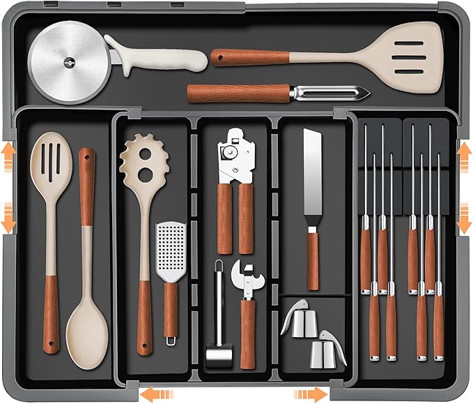 - Maximized Organization: Featuring 3 large compartments (12.6"L × 3.5"W), 2 expandable slots on the side (13.2"L × 4.5"W), and a long slot on top (21"L × 4.6"W), Homecor upgraded kitchen drawer organizer boasting 9 compartments with 3 removeable dividers. Three expandable panels on the left, right, and top maximize space for storing most cooking utensils in the kitchen, such as spatulas, ladles, wine opener, tongs, utensil sets, and whisks