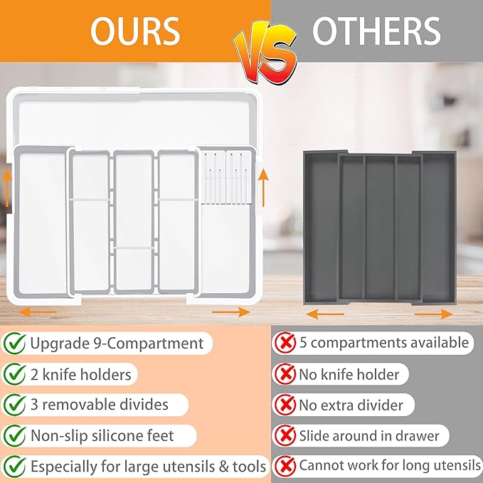 - Considerate Design: Worried about your flatware organizer sliding around in the drawer? Fear not! Our utensil drawer organizer features anti-slip bases on all four corners, keeping items securely in place and preventing unnecessary movement