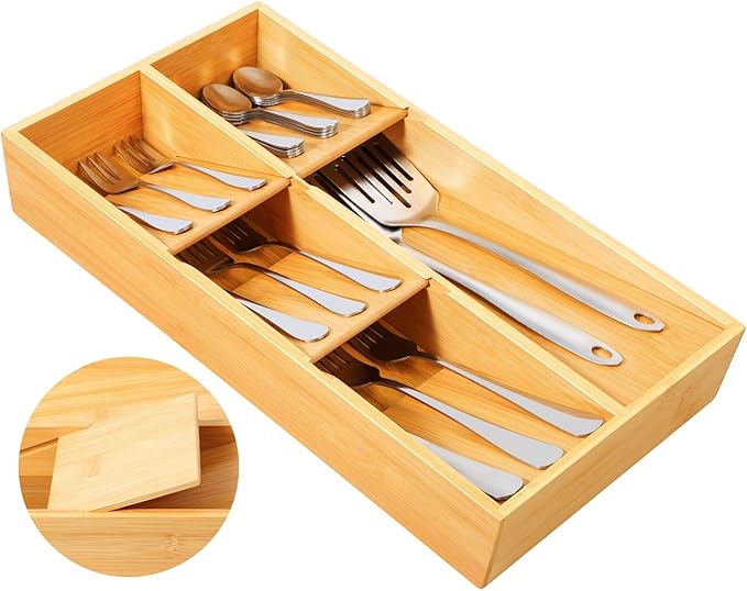 Bamboo Silverware Drawer Organizer, Removable Dividers Kitchen Utensil Drawer Organizer for Different Dimension Flatware, Spoons, Forks, Knives (Natural, 5 Slots)