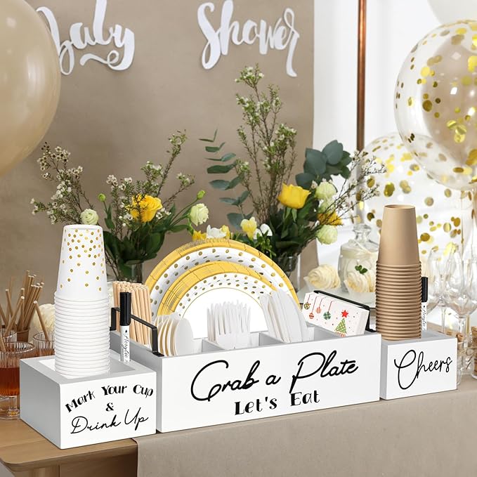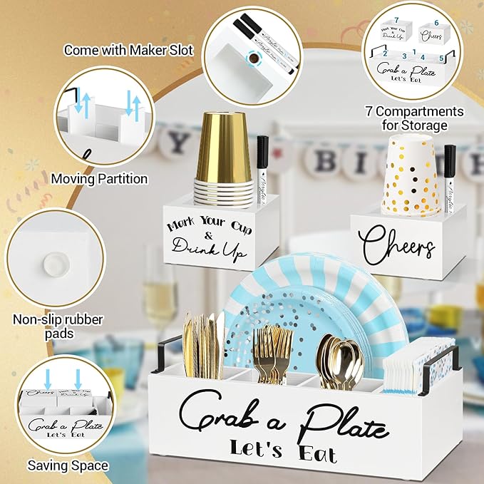 - 【Paper Plate Dispenser with 2 Cup Holders】Our utensil holder set consists of a paper plate holder, 2 cup holders, and 2 markers. The paper plate organizer has 5 compartments, allowing you to organize forks, knives, spoons, plates, napkins, etc. The reasonable compartment design can store everything you need for the party and reduce clutter. 2 Cup dispensers with marker slots can accommodate various sizes of plastic or disposable paper cups. No more worrying about the mess at party events