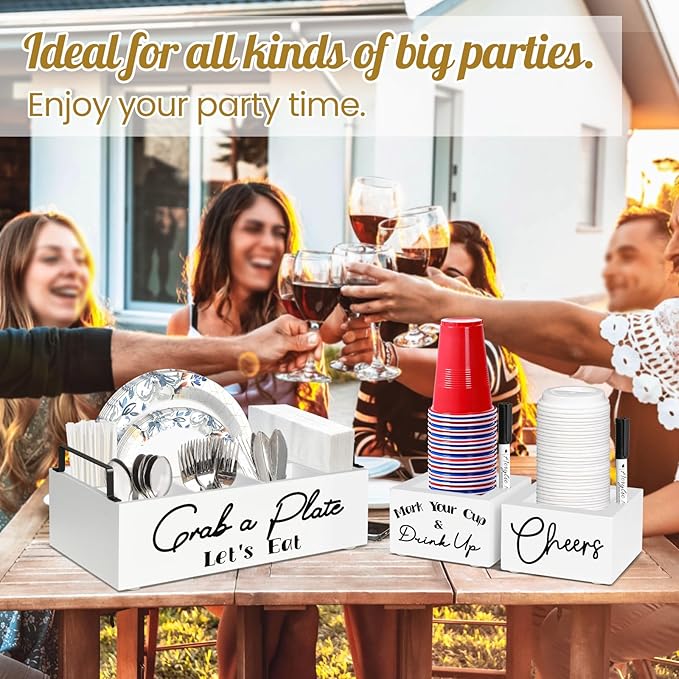- 【Convenient Utensil Caddy for Parties】Our wooden paper plate caddy has 2 metal handles for easy carrying, which is very suitable for organizing and storing cutlery at birthday, weddings, Christmas, picnics, buffets, BBQ, RVs and other party events.The perfect storage function of our wooden napkin holder set makes it widely application, and you can also put it on the kitchen counter, cabinet, dining table. When not in use, just put the cup storage box into the paper plate holder to save space