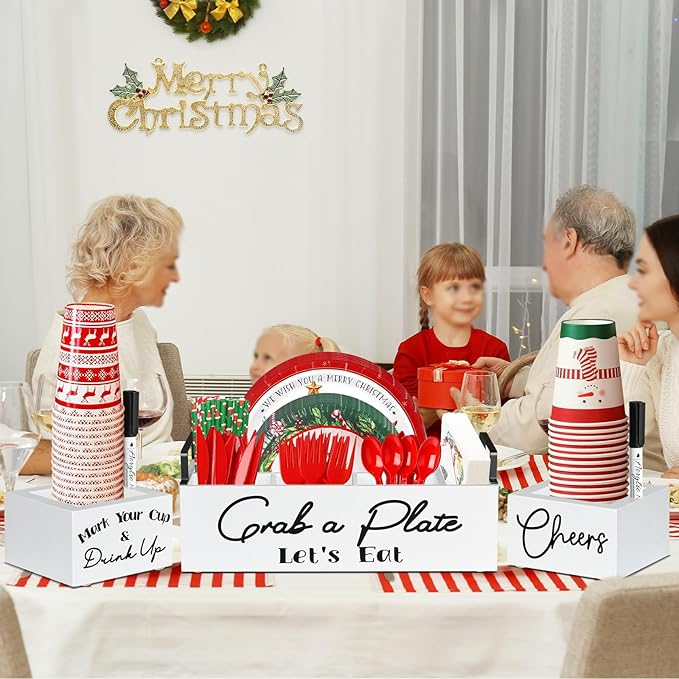 - 【Stylish Silverware Caddy for Kitchen Decor】The utensil caddy holder with cup organizers are not only practical but also add farmhouse decor to your kitchen. This white silverware holders set with black printing “Grab a Plate, Let’s Eat”, “Cheers” and “Make Your Cup & Drink Up” make it cuter. The natural grain of wood adds an element of rustic charm, blending seamlessly with any kitchen decor. It’s time to use this stylish paper plate holders to add rustic home decor or modern decor for your home
