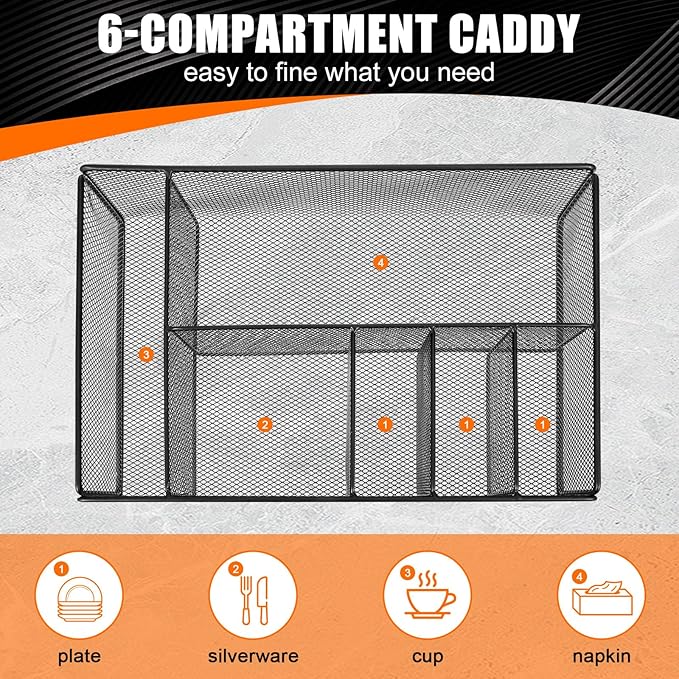 - Paper Plate Dispenser Keep Organized: Our kitchen paper plate holder for counter has 6 compartments, which will help you to separate and organize disposable dishes, spoons, forks, knives, napkins, paper cups, straws and condiments. The open top design of the metal utensil caddy also makes it easy to organize and easily access all dishes or seasonings.