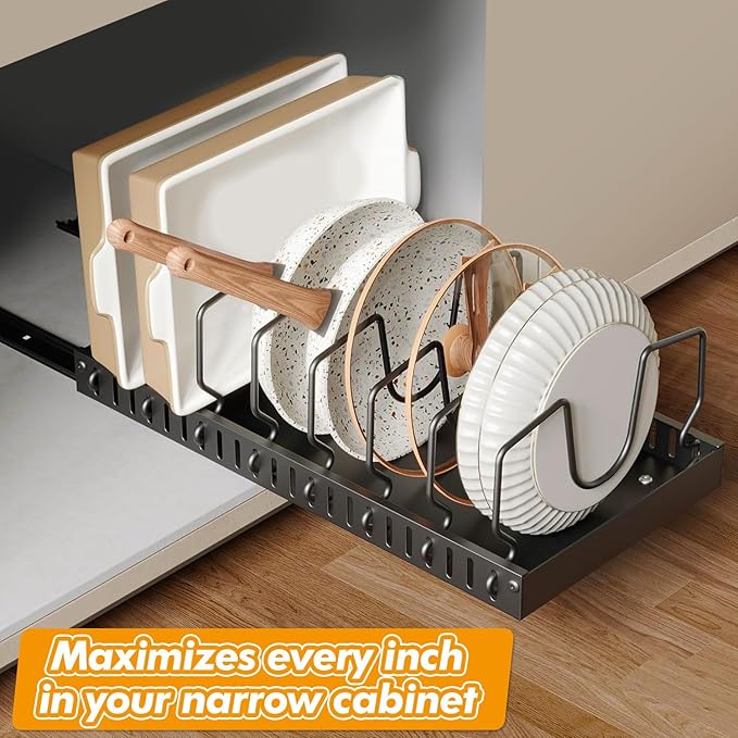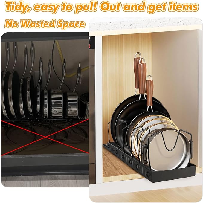 - PULL-OUT DESIGN:Maximize your cabinet storage space with this innovative Pots and Pans Organizer for under Cabinet. The pull-out design allows easy access to all your cookware, keeping your kitchen organized and efficient. Fits pots, pans, lids, and more!