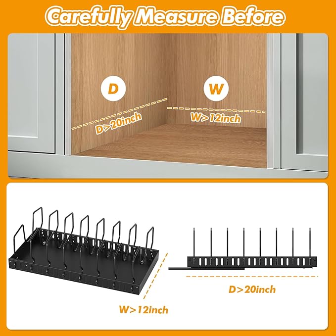 - NOTE:Before purchasing, measure the depth and height of your cabinet to ensure that this pot and pan organizer.Suitable for 6-10 inch lightweight pan. Please ensure that the cabinet width is greater than 10 inches, depth is greater than 20 inches, and height is greater than 12 inches.