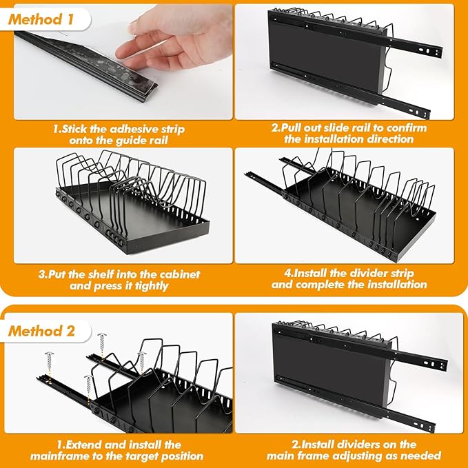 - TWO MOUNTING OPTIONS:Our pan lid organizers inside cabinet is equipped with 2 adhesive tapes to secure the slide rails inside the cabinet Of course you can also choose Secure with screws pot and pan organizer for under cabinet.Assemble our pan lid organizer quickly and easily