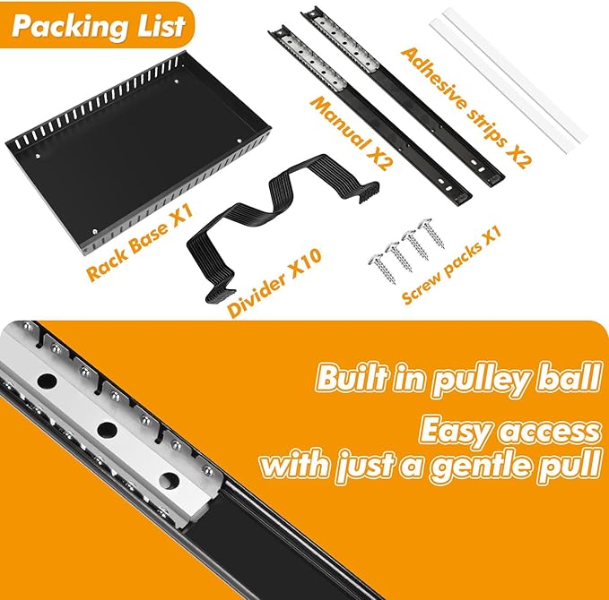 - What You Get:Slide Out Cabinet Organizer Set includes: pull-out pots and pot organizers+10 adjustable dividers+screw packs. If you have any questions about pulling out the lid rack, please contact us and we will provide you with a satisfactory solution.