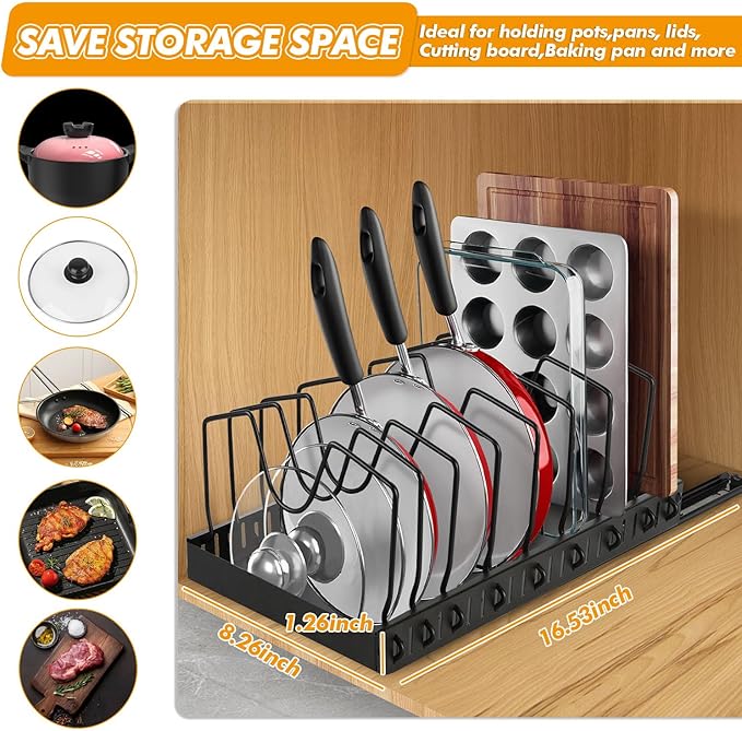 - FEATURES 10 ADJUSTABLE DIVIDERS: Pots and pans organizer under cabinet is equipped with 10 adjustable dividers giving you the freedom to customize the width of the storage space based on the size of your pots and lids. making it easy to find and access what you need while keeping your kitchen clutter-free.