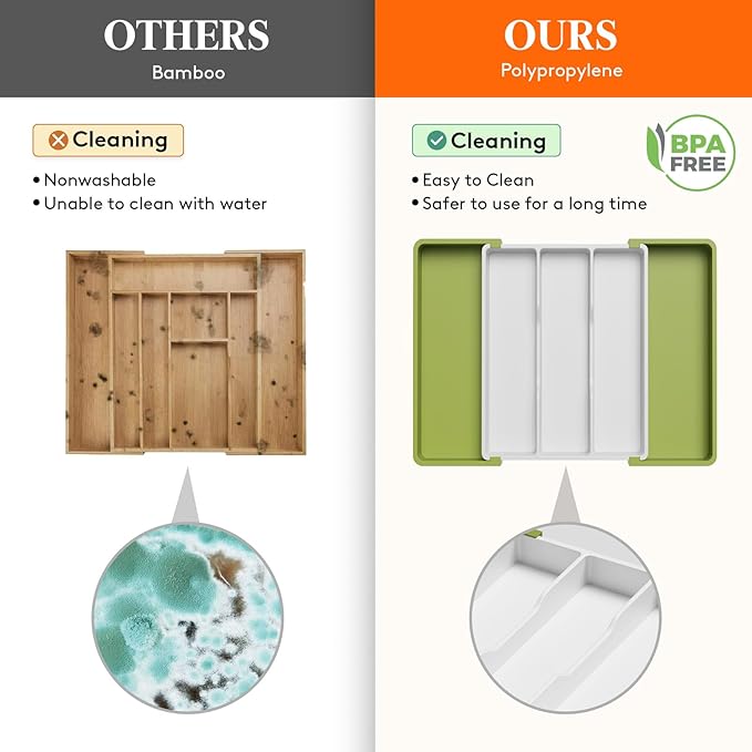 - Safe to Use: Crafted from BPA-free PP material, this cutlery drawer organiser guarantees the safety of all your utensils, silverware, and cutlery. Cleaning is a breeze as well - simply rinse with water to remove stains.