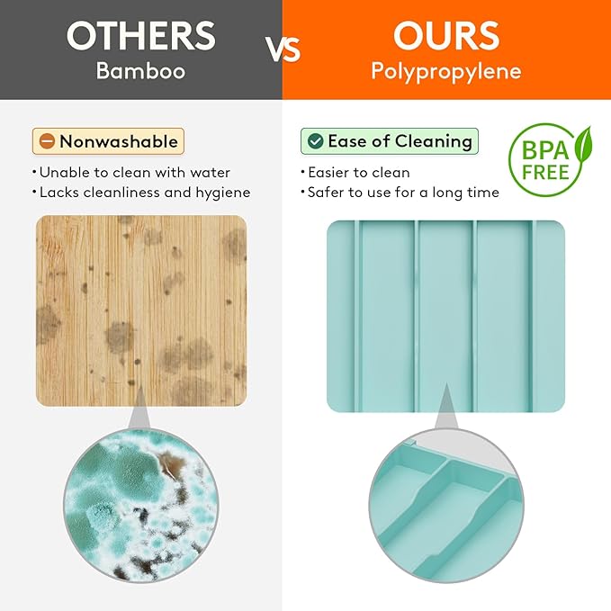 - Safe to Use: Crafted from BPA-free PP material, this cutlery drawer organiser guarantees the safety of all your utensils, silverware, and cutlery. Cleaning is a breeze as well - simply rinse with water to remove stains.